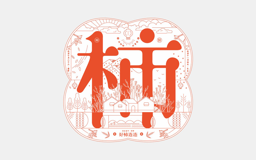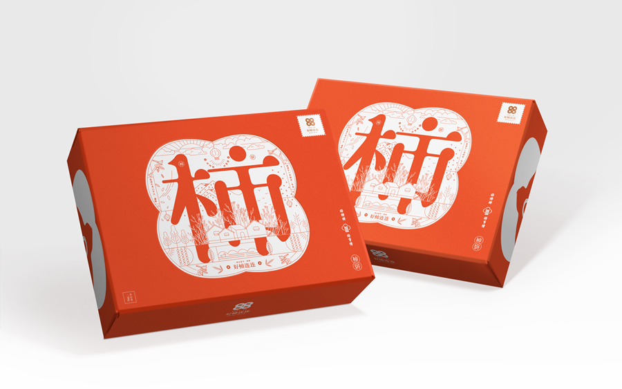 為了契合好柿餅好事情的產品理念,我們在設計上,力求營造這一品牌氣質,同樣的吸收原料篩選的嚴謹苛刻,注重品質感和形態(tài)視覺美學的精雕細琢,為了保證純正天然的視覺感受,包裝整體以柿子天然色作為主體色,在其正面,以柿子的剪影作為整個包裝的視覺中心,圍繞其我們創(chuàng)作了優(yōu)美線條感的圖形,描述了柿餅形成的兩大節(jié)氣過程-霜降和冬至,簡潔的線條概括了好柿餅的升華過程,在畫面的最中心是富平生態(tài)農家田園風的生態(tài)景觀,底部是富平石川河的描述,簡潔凝練的線條,營造出了富有詩意的品牌氣質,同時講述了好柿連連的品牌故事。在包裝的標識部分,我們運用了郵票的形式,意在強調產品的獨一無二,私人定制性和專屬性,最好的產品屬于追求最好的你,將最好的柿餅送寄給你,為你帶了好事情好運氣。