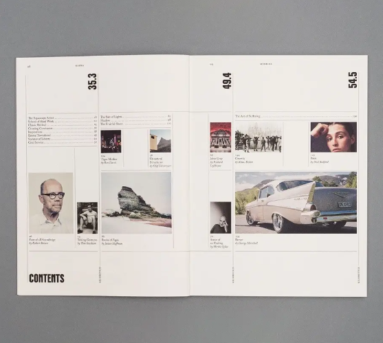 將目錄中的元素(頁碼、標(biāo)題、圖片)用表格的形式來排列,這么做也可以使信息更加清晰,更有秩序。由于這種做法在目錄設(shè)計中并不常見,所以顯得很特別。
