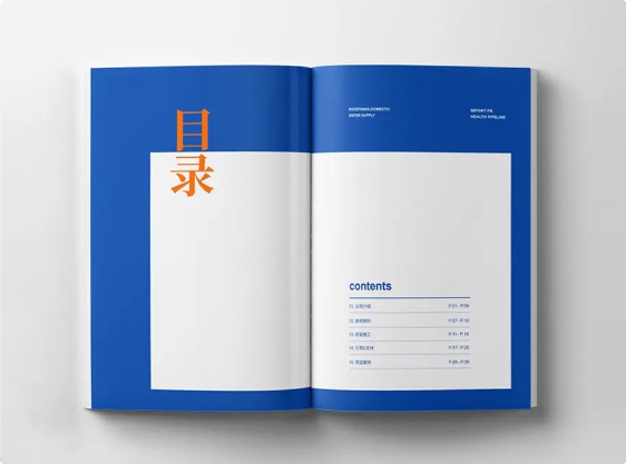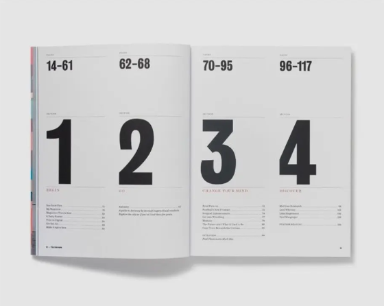 頁碼或者序號是目錄頁必不可少的元素,章節(jié)細分比較多的目錄都會標(biāo)明頁碼,而分類比較少的目錄一般會采用序列號,用來區(qū)分幾個大板塊。把頁碼或序號拉大并使用筆畫比較粗的字體,除了可以使其更明了、醒目以外,還可以增加版面的大小對比,提升設(shè)計感。