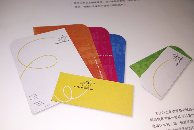 每一張紙第一面設(shè)計(jì)都以簡介為期特色,公司標(biāo)語和一條螺旋形的線條搭配和諧,令人愉快,而網(wǎng)站“.com”名字上的微小紅色圓點(diǎn)卻很是耀眼。現(xiàn)從印刷品上很難看清,另一面卻用亮色(信封都是提前印刷的),顏色、層次、構(gòu)圖以及深色字跡的介紹形成對(duì)比。