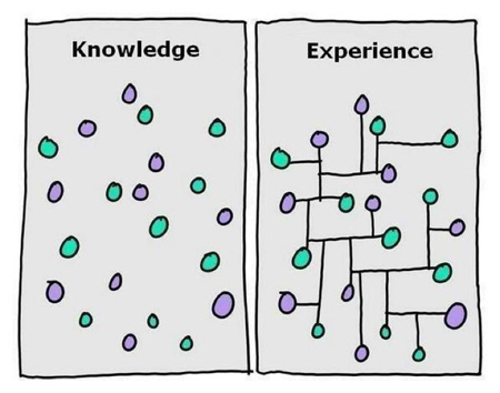 某天 Belle Beth Cooper 透過部落格 buffer 的官方帳號(hào)在 Twitter 上分享這張圖片時(shí),很快地就有超過 1,000 次以上的轉(zhuǎn)推,代表這相當(dāng)能引起大眾的共鳴,也讓她開始思考該如何將知識(shí)連結(jié)。這張圖片清楚地點(diǎn)出知識(shí)與經(jīng)驗(yàn)的不同:
